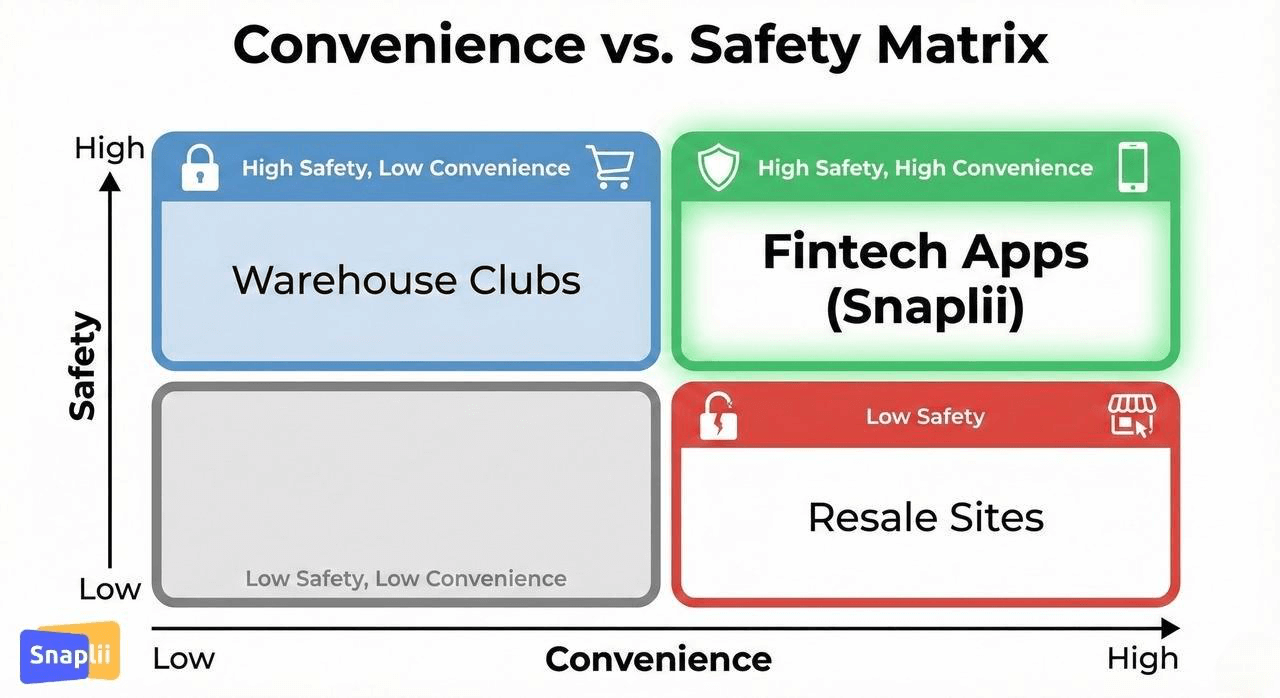 | Feature | Fintech Apps (Snaplii) | Warehouse Clubs | Credit Card Portals | Resale Sites (Grey Market) |